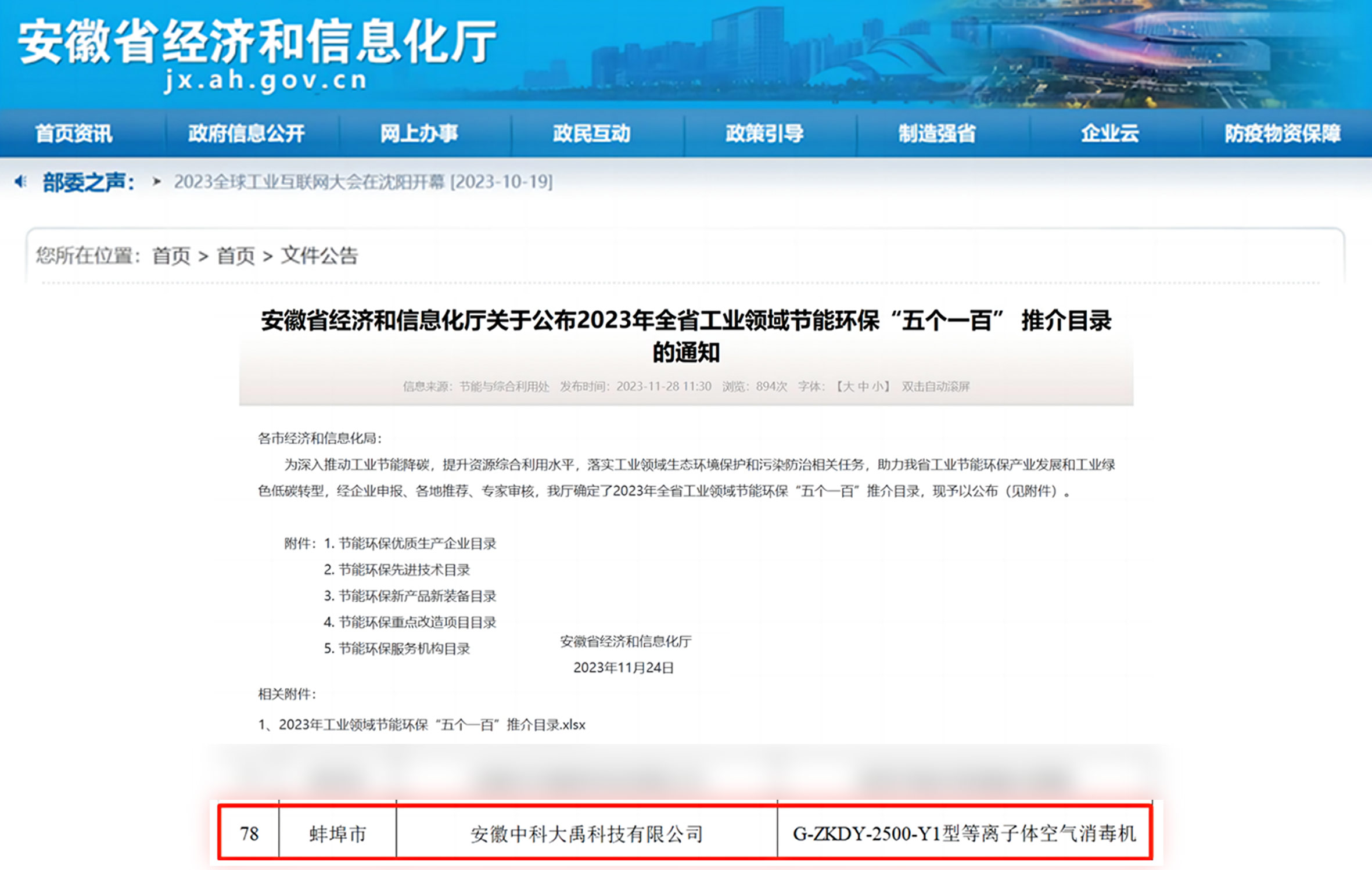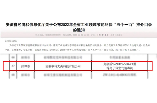 入選2023年全省工業(yè)領(lǐng)域節(jié)能環(huán)?!拔鍌€一百”推介目錄(節(jié)能環(huán)保新產(chǎn)品新裝備:G-ZKDY-2500-Y1型等離子體空氣消毒機)